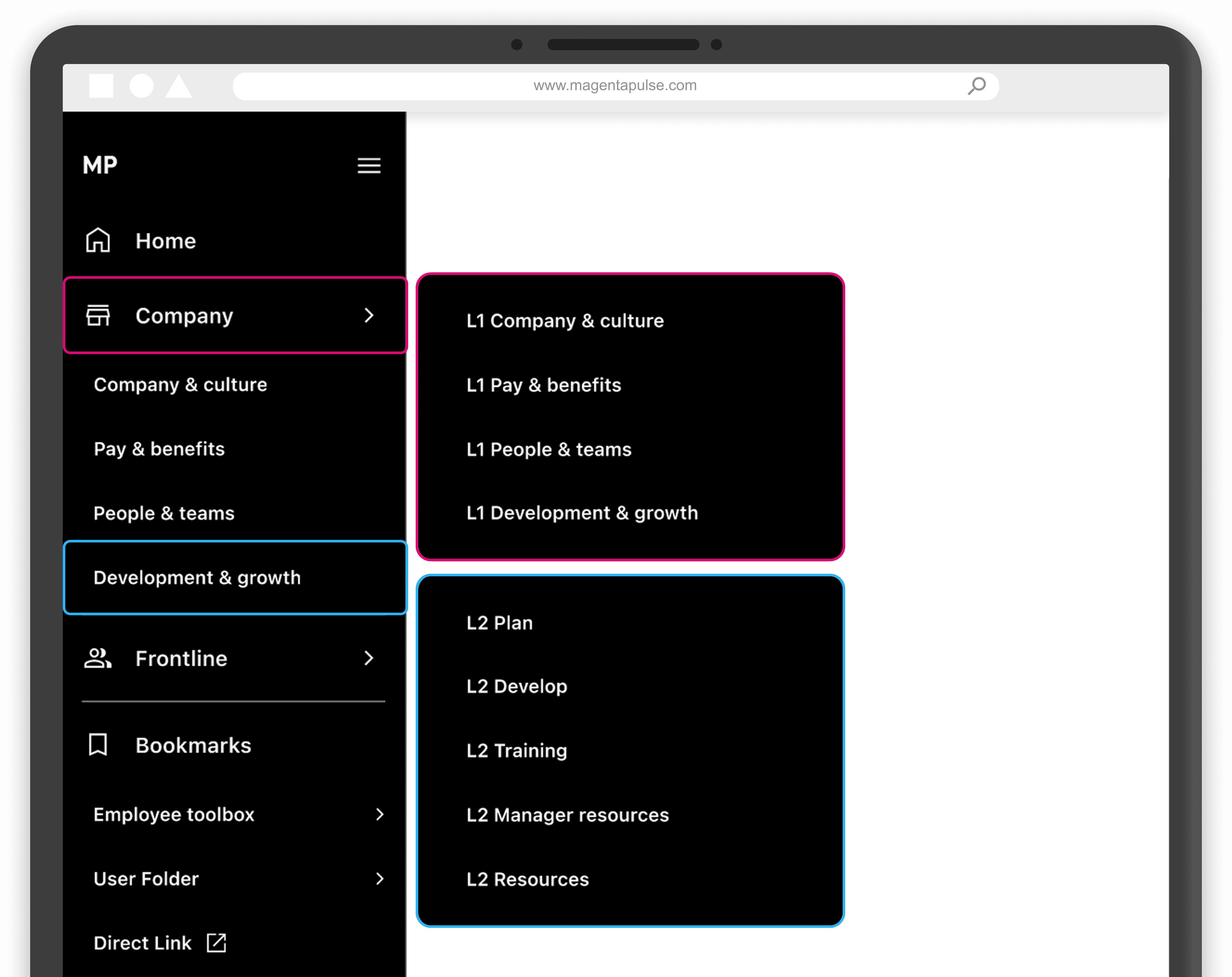 Early proposal showing corporate and frontline content separated, with L1 and L2 hierarchy revealed on hover.