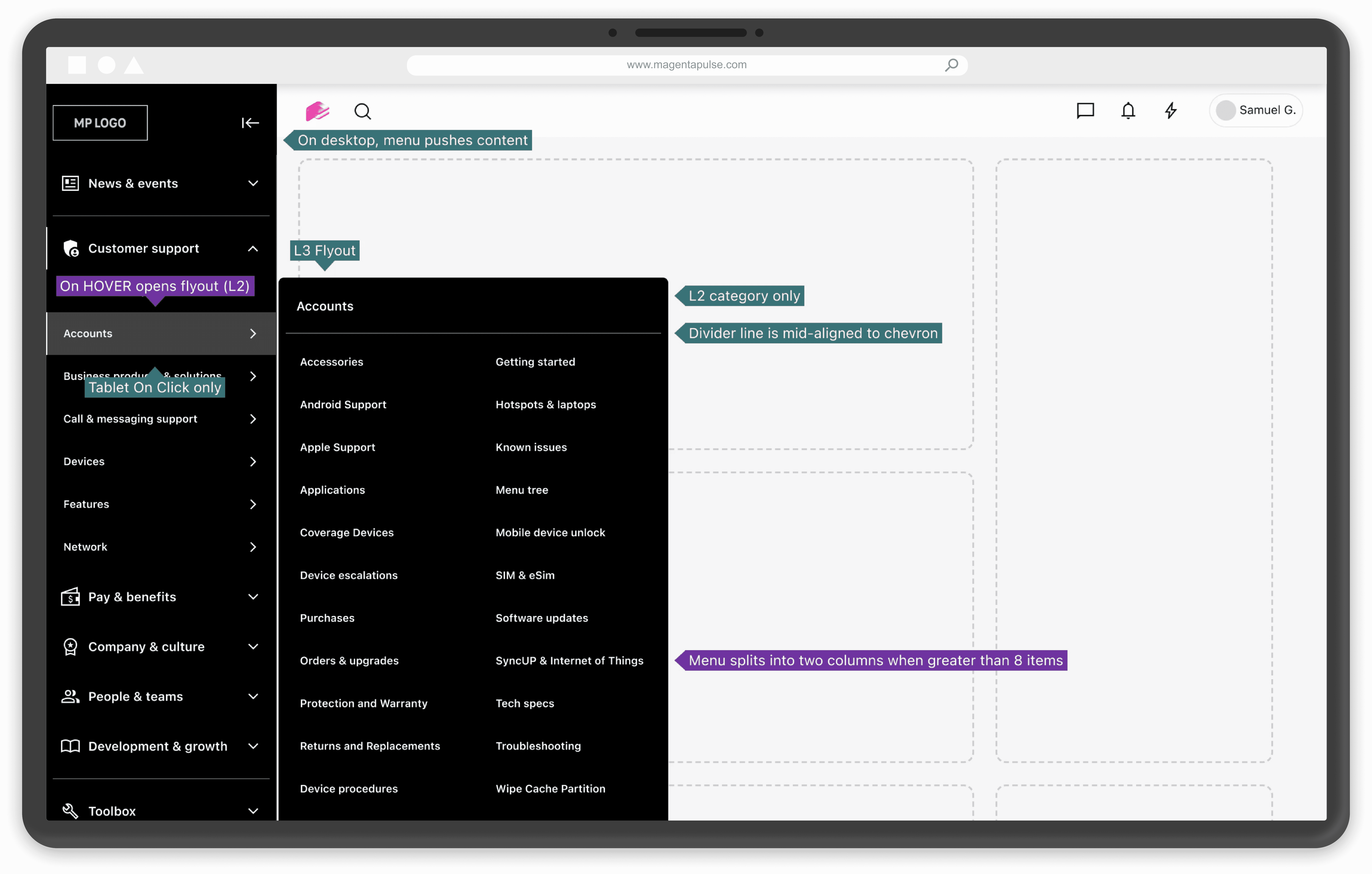 L3 - Pages and topics revealed in a flyout panel on hover of an L2 item