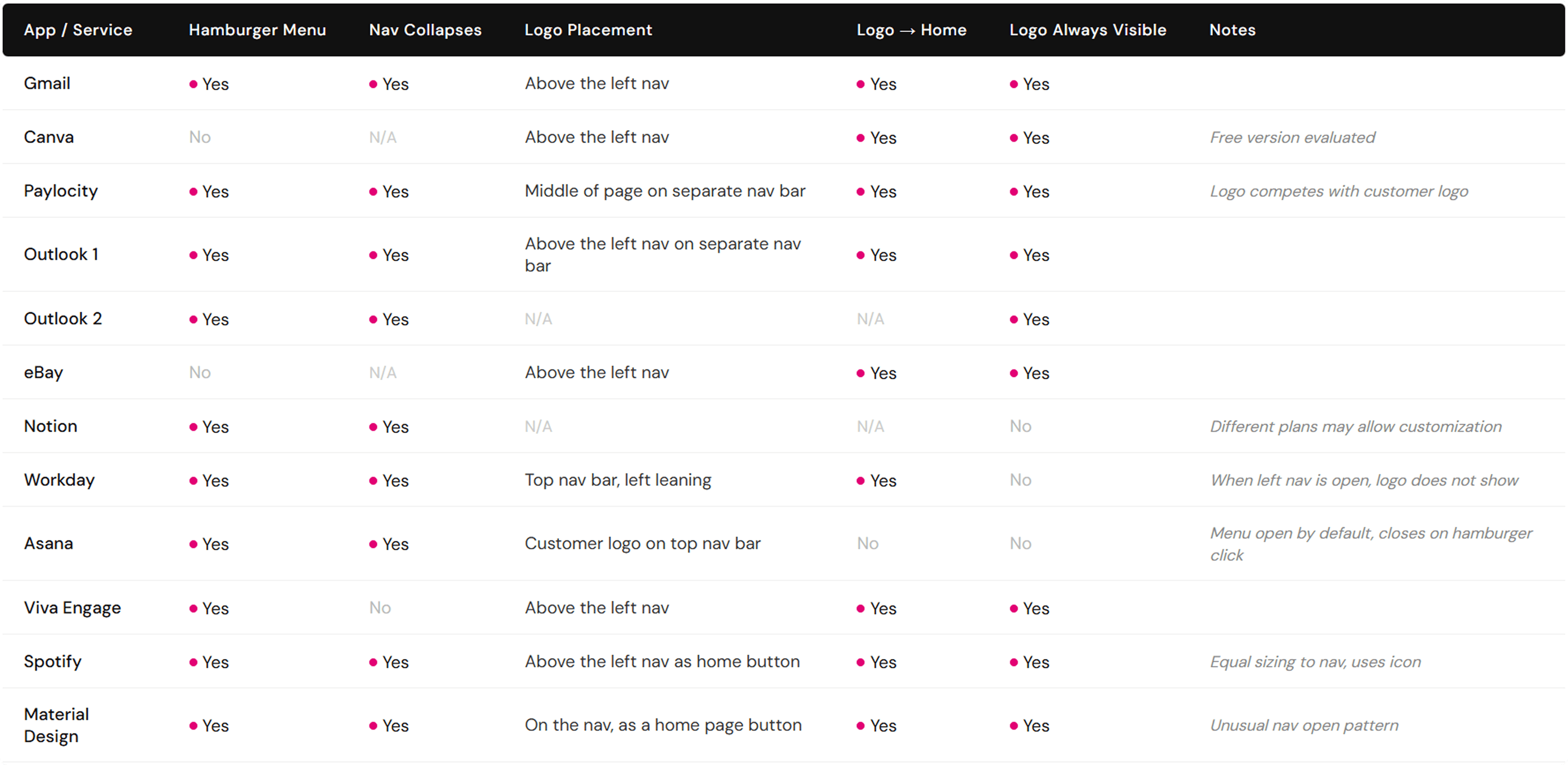 Competitive benchmarking of logo placement and nav behavior across widely used services.