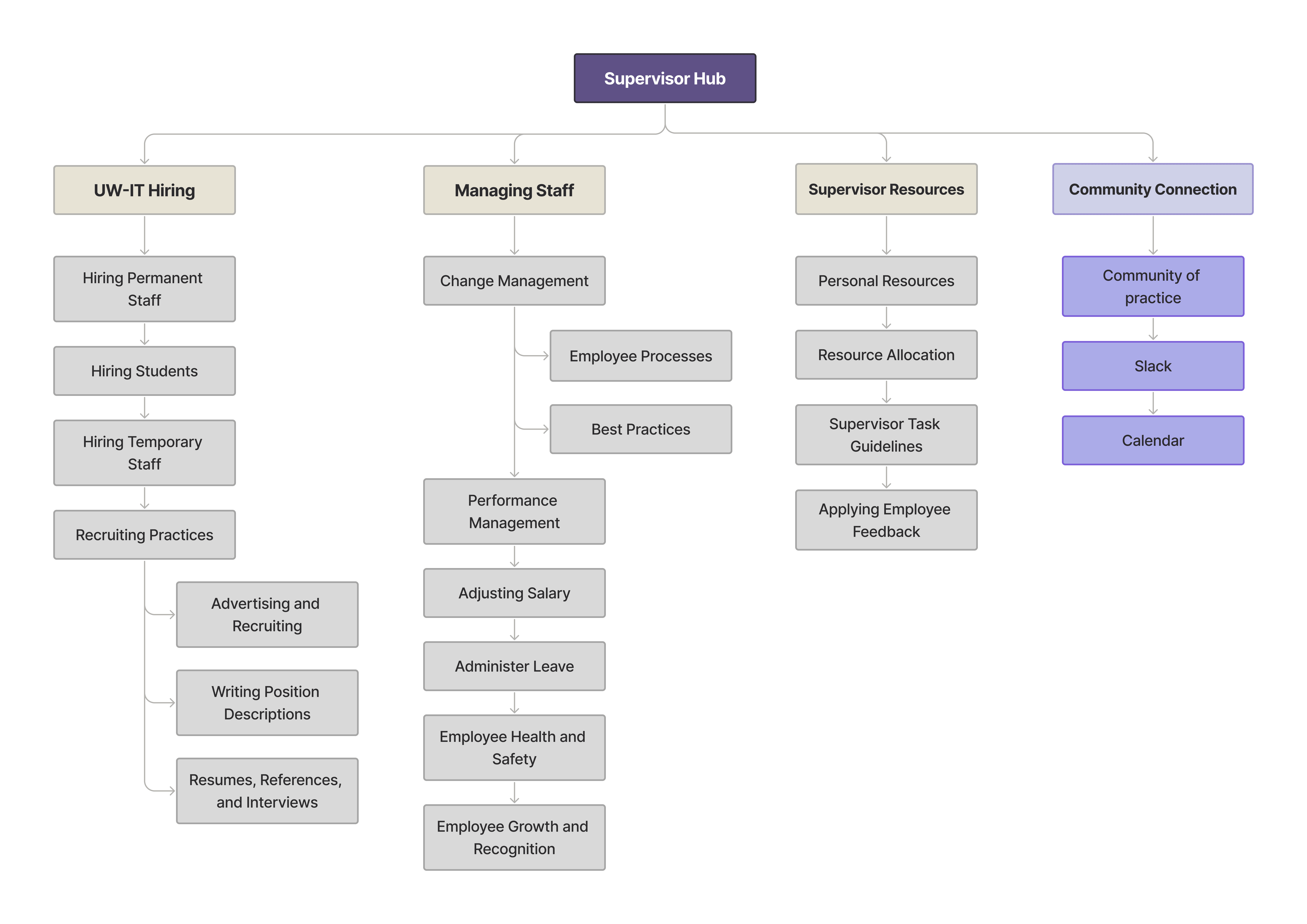 Leadership initially requested a simple port to a new WordPress platform. My manager and I saw an opportunity for a comprehensive improvement, presenting directly to the UW-IT CIO and securing sign-off to build a one-stop Supervisors Hub as a growable foundation for all supervisory needs.